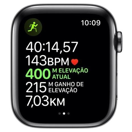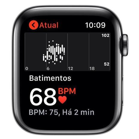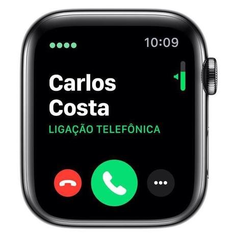 Apple Watch Series 5 Cellular + GPS, 44 mm, Aço Inoxidável Cinza Espacial, Pulseira de Aço Inoxidável Preto e Fecho Magnético – MWWL2BZ/ACom tela sempre ativa, o Apple Watch Series 5 mostra as horas e informações importantes sem que você precise levantar o pulso. Tem bússola integrada para você saber em que direção está seguindo. Faz ligações de emergência em outros países. Acompanha seus exercícios e atividades. E conta com rede celular integrada para você ficar conectado longe do seu telefone.O app Exercício exibe até cinco métricas ao mesmo tempo para você acompanhar com precisão todos seus treinos favoritos. Registre seus exercícios com GPS e elevação e use a bússola integrada para saber a direção que está seguindo. Monitore suas corridas com recursos avançados, como cadência e alertas de ritmo. E mantenha a motivação fazendo streaming de 50 milhões de músicas do Apple Music.Receba notificações de frequência cardíaca alta e baixa, veja alertas quando os decibéis chegarem a níveis que podem afetar sua audição e acompanhe seu ciclo menstrual. O Apple Watch Series 5 também tem recursos excelentes de segurança, como detecção de queda, SOS de Emergência.Os círculos de Atividade dão uma visão geral das métricas Movimento, Exercício e Ficar em Pé ao longo do dia. Você pode monitorar seu progresso como passar do tempo usando o recurso Tendências do app Atividade do iPhone. E, para se manter motivado, o Apple Watch traz competições, atividades compartilhadas com os amigos, orientações personalizadas, desafios mensais e prêmios para suas conquistas.Atenda ligações e responda a mensagens de uma trilha. Faça streaming do Apple Music e do Apple Podcasts. Levante o pulso e peça à Siri o que você precisar. Apple Watch Series 5 com rede celular. Fácil de ficar conectado,mesmo longe do seu telefone.CaracterísticasMarca: AppleModelo: Apple Watch Series 5 Cellular + GPSCor: Caixa em aço inoxidável cinza espacial e pulseira aço inoxidável pretoReferência: MWWL2BZ/ACód.: 212969EspecificaçõesTela Retina Sempre Ativa10,7 mm de espessuraSensor cardíaco elétricoSensor cardíaco óptico de segunda geraçãoBússolaDetecção de quedaProcessador S5 de dois núcleos de 64 bitsDigital Crown com resposta tátilAcabamentoCaixa de aço inoxidávelPulseira de 44 mm: para pulsos de 140 a 210 mmRecursosGPS, GLONASS, Galileo e QZSSBússolaAltímetro barométricoResistente à água (50 metros)*Sensor cardíaco elétricoSensor cardíaco óptico de segunda geraçãoSOS de EmergênciaAcelerômetroGiroscópioSensor de luz ambienteAlto-falanteMicrofoneApple PayGymKit32 GB de capacidadeParte de trás em cerâmica e cristal de safiraTela44 mm 368 x 448 pixels / Área de visualização de 977 mmTela Retina Sempre Ativa OLED LTPO com Force Touch 1000 nits de brilhoProcessadorS5 com processador de dois núcleos de 64 bitsConectividadeWi-Fi 802.11b/g/n 2,4 GHzBluetooth 5.0LTE e UMTS**BateriaBateria interna recarregável de íon de lítio até 18 horas***Carregador magnéticoCarregador USBItens InclusosApple WatchCabo com carregador magnético (1 m)Pulseira (pode ser ajustada para os tamanhos P/M ou M/G)Guia de início rápidoDimensões 44mmTamanho (A x L x P): 44 x 38 x 10,7 mmCaixa: 36,7 gramasGarantia: 12 meses*O Apple Watch Series 5 tem classificação de 50 metros de resistência à água segundo a norma ISO 22810:2010. Isso significa que pode ser usado para atividades aquáticas de pouca profundidade, como nadar em uma piscina ou mar. No entanto, o Apple Watch Series 4 não deve ser usado para mergulho, esqui aquático ou outras atividades que envolvam velocidade na água ou submersão mais profunda.**O Apple Watch Series 5 oferece conectividade Cellular a partir do iPhone 6, com a mesma operadora em ambos. (Operadora compatível Claro e Vivo)***A duração da bateria varia de acordo com o uso e a configuração; os resultados reais podem variar.
