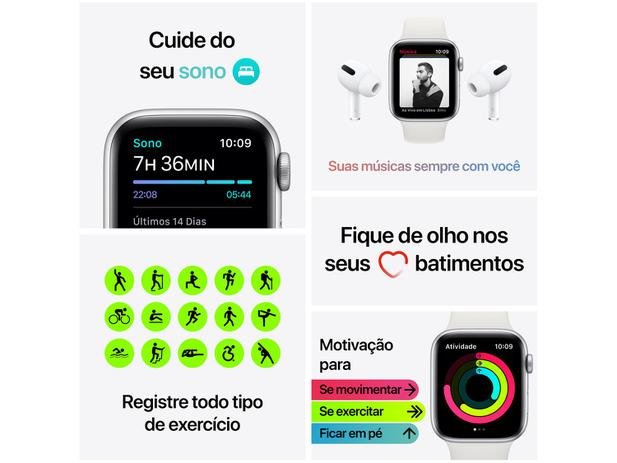 O Apple Watch SE tem o mesmo tamanho de tela Retina do Series 6 para mostrar mais informações. Ele também vem com sensores avançados que registram todos os seus objetivos de boa forma e exercícios, além de recursos poderosos para manter você saudável e em segurança. O app Sono permite criar uma rotina para dormir e monitorar seu sono. Além disso, você recebe ligações e mensagens e ouve música direto do seu pulso. É muito para gostar por menos do que você imagina.Avisos legais:O Apple Watch SE requer iPhone 6s ou posterior com iOS 14 ou posterior.*Norma ISO 22810:2010. Apropriado para atividades aquáticas em pouca profundidade, como natação. Não é recomendado para atividades que envolvam submersão mais profunda ou velocidade na água.**A notificação de ritmo cardíaco irregular não foi desenvolvida para pessoas que já foram diagnosticadas com fibrilação atrial.***Para usar o SOS de Emergência, seu iPhone precisa estar por perto.