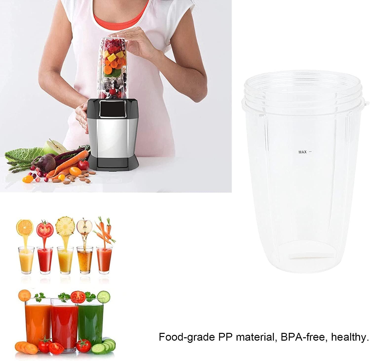 Os 946 ml são do tamanho perfeito para fazer sua receita de bebida individual favorita. Tamanho compacto, leve, conveniente para transportar e ótimo para armazenamento. Combina perfeitamente com o seu espremedor, fácil de substituir, serve para espremedores de nutri. Design de boca larga, fácil de limpar, simples e conveniente, não machuca suas mãos. Usando material PP de grau alimentício, livre de BPA, saudável, resistente e durável para usar.