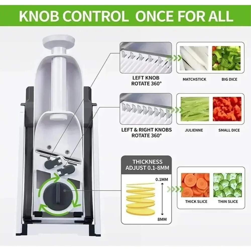 O fatiador manual multifuncional ajustável é um utensílio de cozinha projetado para facilitar a preparação de alimentos de forma prática e eficiente. Fabricação em materiais como aço inoxidável e plástico resistente garantem durabilidade e resistência ao desgaste, tornando-o ideal para uso diário em diversas condições culinárias.