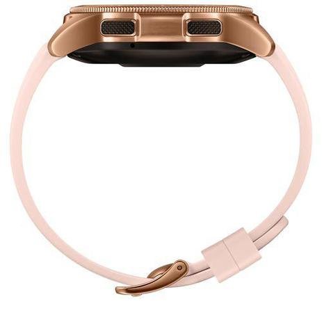 O smartwatch ideal para quem tem um estilo de vida ativo e saudável. Mantém você sempre conectado através do 4G. Bonito e confortável, monitora diariamente suas atividades físicas e os comportamentos de nível de stress e sono.É robusto para aguentar seu ritmo de treino, tanto em terra quanto na água. Ssua resistência à água é de 50 metros. Ele vem equipado com GPS que rastreia com maior precisão suas trilhas. Características Sistema Operacional Tizen Based Wearable OS 4.0 Tela Tamanho da Tela: 1,2″ (30 mm) Resolução da Tela: 360 x 360 Touchscreen: Sim Material da Tela: Super AMOLED Conectividade Bluetooth 4.2 Wi-Fi NFC Capacidade 4GB* * Parte da memória interna já é utilizada pelo sistema operacional e aplicativos pré-instalados Processador Dual-Core Memória RAM 1,5GB Caixa Material da Caixa: Alumínio Cor da Caixa: Rosé Pulseira Material da Pulseira: Silicone Cor da Pulseira: Rosé Bateria Tipo de Bateria: Ions de Lítio Duração da Bateria: 270 mAh Carregamento: Sem-fio Outros Recursos Resistente à Água: 5 ATM (50 metros) Glonass, A-GPS Conexão 4G LTE1 independente Faz e recebe chamadas Bateria de longa duração Monitoramento automático de atividades Fitness & Saúde Suporta mais de 39 tipos de treinos esportivos Funções de monitoramento de estresse e sono Tela mais resistente a riscos Durabilidade da caixa padrão militar Compatibilidade Smartphones Android 5.0 ou superior, com memória RAM de 1.5GB ou acima iPhone 5 ou superior, com Sistema Operacional iOS 9.0 ou acima EAN 8801643496067 Especificações Técnicas Modelo: SM-R815FZDAZTO Garantia: 12 meses Dimensões e Peso Dimensões do produto sem embalagem (AxLxP): 41,9×45,7×12,7mm Dimensões do produto com embalagem (AxLxP): 130x131x73,2 mm Peso do produto sem pulseira: 0,049 kg Peso do produto com embalagem: 0,313 kg Itens Inclusos 01 Relógio Galaxy Watch 01 Carregador Sem fio tipo Dock 01 Fonte de Alimentação 01 Pulseira Pequena 01 Manual Usuário