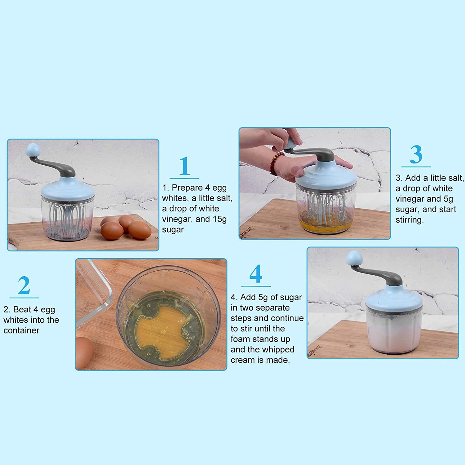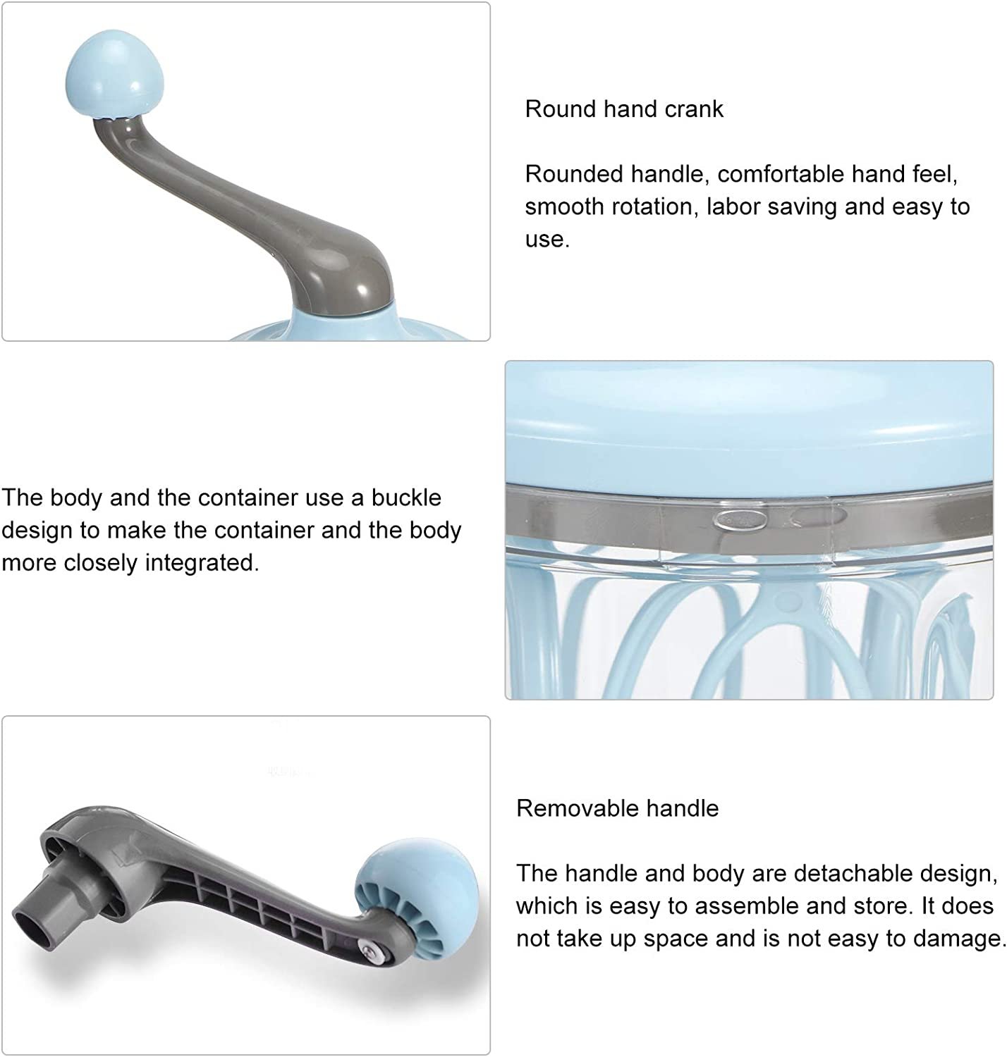 O design antiderrapante na parte inferior, grande área de almofadas antiderrapantes para os pés na parte inferior, forte capacidade antiderrapante, torna o recipiente mais estável e antiderrapante quando você mexe. A fivela de limite, o corpo e o recipiente usam um design de fivela, para que o recipiente e o corpo estejam mais próximos integrados. Hastes de agitação de quatro eixos, usando um design de haste de agitação coaxial de 4 grupos, cada grupo de 4 hastes giram um círculo ~ 320 vezes de agitação. Alça removível, design destacável da alça e do corpo, fácil de montar e armazenar, ocupa menos espaço e não é fácil de danificar. A manivela é confortável ao toque, gira suavemente, economiza trabalho e é fácil de usar.