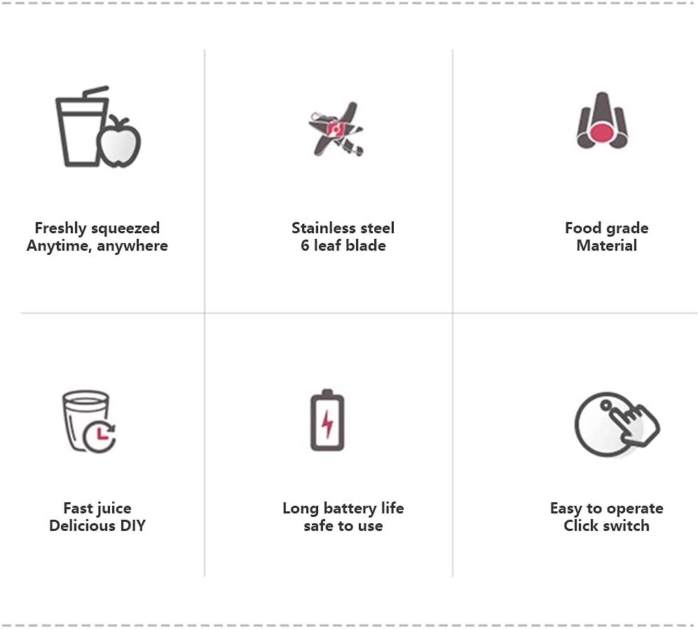 ✔ 【Potentes 6 lâminas】O extrator de liquidificador portátil é projetado com 6 lâminas de aço inoxidável 304 e sistema de alimentação forte, motor de cobre puro, velocidade rápida e longa vida útil, que pode fazer frutas e legumes em uma vitamina dentro de 1 minuto. ✔ 【Segurança e saúde】Interruptor magnético ultra seguro de usar e limpar, o copo de espremedor vai parar de funcionar quando o corpo e a parte inferior se separarem. O copo de suco compacto e portátil é feito de materiais PCGT ecológicos e de grau alimentício. Cabe na maioria dos suportes de copo de tamanho padrão, você pode desfrutar da retenção de nutrientes frescos e um maravilhoso tempo de lazer. ✔ 【Bateria embutida de 4000 mAh】O copo de suco USB é equipado com baterias recarregáveis de alta qualidade de 4000 mAh que podem ser recarregadas de várias formas, como carregamento por carregador portátil, adaptador CA e computador, e o tempo de carregamento é de 3 a 5 horas; totalmente carregado pode produzir 15 a 20 xícaras de suco. ✔ 【Multifunção】Este liquidificador portátil é ótimo para fazer misturas de suco, misturar frutas e legumes, café, leite em pó, shake de proteína, comida suplementar para bebês. ✔【Nutriente e vitamina seguras】Feito de material PCTG não tóxico de grau alimentício. Este liquidificador de vitaminas extrai nutrição saudável de frutas e legumes, é uma escolha perfeita para manter seu corpo fresco e saudável a qualquer hora e em qualquer lugar.