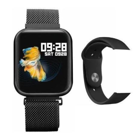 O relógio Possui a opção de poder colocar sua própria foto como capa do relógio. – Receber Notificações de redes sociais SMS entre outros. – Basta Girar o pulso para mostrar as horas. – 3 Modelos de mostradores de relógio diferentes para uso (analógico e digital) – Lembrete sedentário, te lembra que você está muito tempo parado e precisa levantar, alongar, etc. – Alarme com vibração para que não perca o horário – Controla as músicas do seu celular (troca música, antes, depois, pause e play) – Previsão do tempo diário direto no seu relógio – Batimentos Cardíacos – Controle de sono – Calcula passos, km e calorias – GPS – Rota (Usando App No celular) – Controle de Pressão Arterial – É possível aumentar e diminuir luminosidade da tela – Excelente Tempo de Duração da bateria – Carregamento magnético – Photo Control, mire com o celular no local onde quer bater a foto e clique no relógio para bater a foto direto pelo relógio! – 8 modelos de sensores de movimentos para controle de diferentes esportes na palma da sua mão! (Caminhada, Corrida, Pular Corda, Bike, Badminton, Basquete e Futebol) – Pulseira com fecho magnético ergonômico ajustável (milanese) ou pulseira de silicone, serve para todos os pulsos. – É possível trocar de pulseiras ESPECIFICAÇÕES: – Cor PRETO – Display colorido – Tamanho da Tela: 38mm – 1,3 polegadas – Bluetooth 4.0 – Método de carregamento: interface in-line de carregamento magnético – Bateria: 200mAh – Tempo de carregamento: 2 h mais ou menos – Matérias da pulseira: Silicone e Milanese (Magnética) – Resolução: 240 PRODUTO ACOMPANHA: – 1 Smartwatch – 1 Manual – 1 Pulseira Silicone + 1 Pulseira Milanese – 1 Carregador para o Relógio1 FONE DE OUVIDO I11