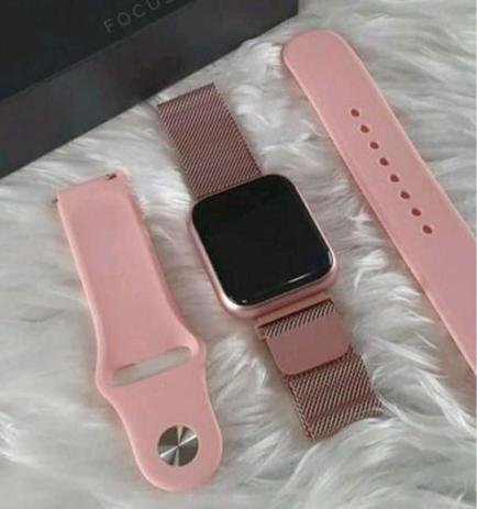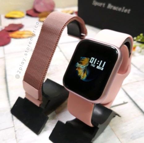 – O relógio Possui a opção de poder colocar sua própria foto como capa do relógio. – Receber Notificações de redes sociais SMS entre outros. – Basta Girar o pulso para mostrar as horas. – 3 Modelos de mostradores de relógio diferentes para uso (analógico e digital) – Lembrete sedentário, te lembra que você está muito tempo parado e precisa levantar, alongar, etc. – Alarme com vibração para que não perca o horário – Controla as músicas do seu celular (troca música, antes, depois, pause e play) – Previsão do tempo diário direto no seu relógio – Batimentos Cardíacos – Controle de sono – Calcula passos, km e calorias – GPS – Rota (Usando App No celular) – Controle de Pressão Arterial – É possível aumentar e diminuir luminosidade da tela – Excelente Tempo de Duração da bateria – Carregamento magnético – Photo Control, mire com o celular no local onde quer bater a foto e clique no relógio para bater a foto direto pelo relógio! – 8 modelos de sensores de movimentos para controle de diferentes esportes na palma da sua mão! (Caminhada, Corrida, Pular Corda, Bike, Badminton, Basquete e Futebol) – Pulseira com fecho magnético ergonômico ajustável (milanese) ou pulseira de silicone, serve para todos os pulsos. – É possível trocar de pulseiras ESPECIFICAÇÕES: – Cor Rosa – Display colorido – Tamanho da Tela: 38mm – 1,3 polegadas – Bluetooth 4.0 – Método de carregamento: interface in-line de carregamento magnético – Bateria: 200mAh – Tempo de carregamento: 2 h mais ou menos – Matérias da pulseira: Silicone e Milanese (Magnética) – Resolução: 240 PRODUTO ACOMPANHA: – 1 Smartwatch – 1 Manual – 1 Pulseira Silicone + 1 Pulseira Milanese – 1 Carregador para o Relógio
