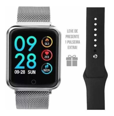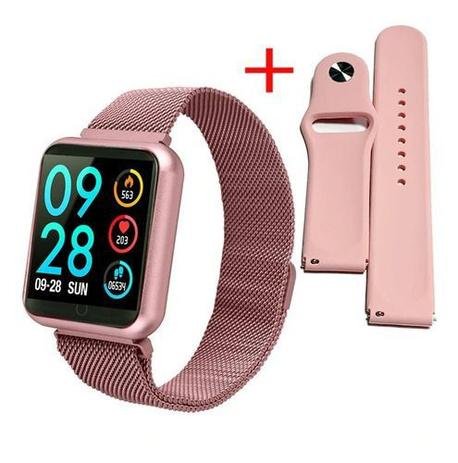 Relógio Smartwatch Rosa Smartband P70, Bluetooth, Monitor Cardíaco Pressão Arterial Sono e Passos. Pulseira de Silicone + Milanese de (Conforme disponibilidade) Lançamento Smart Watch Smartband Sport-B que controla sua saúde durante o dia a dia e ainda por cima te mantém em extremo estilo. Tela do relógio acende automático ao levantar o pulso – 3 mostradores de relógio diferentes para uso (2 versões analógico e 1 versão digital) – Lembrete sedentário, te lembra que você está muito tempo parado e precisa levantar, alongar, etc. – Alarme com vibração para que não perca o horário – Controla as músicas do seu celular (troca música, antes, depois, pause e play) -Não é a prova d’agua IP67, você pode utlizar no uso diário, mas não pode mergulhar ou praticar natação com o relógio! – Batimentos Cardíacos (não serve para uso profissional) – GPS – Rota (em uso com o celular pelo app) – Controle de Pressão Arterial (não serve para uso profissional) – É possível aumentar e diminuir luminosidade da tela – Excelente bateria de 5 dias em standby e média de 2 a 3 dias em uso moderado – Carregamento magnético – Photo control, mire com o celular no local onde quer bater a foto e clique para bater a foto direto pelo relógio! – Recebe notificações de ligações, e-mail, redes sociais em geral (aparece a mensagem e pode ler, não pode responder) – Sleep monitoring – Controle de sono – 8 modelos de sensores de movimentos para controle de diferentes esportes na palma da sua mão! (Caminhada, Corrida, Pular Corda, Bike, Badminton, Basquete e Futebol) – Calcula passos, km e calorias – Relógio com linguagem em inglês ou espanhol, porém aplicativo do celular em português, uso extremamente fácil e prático – Pulseira com fecho magnético ergonômico ajustável (milanese) + pulseira de silicone, serve para todos os pulsos (conforme escolha) – É possível trocar de pulseiras *Todos os nossos itens são conferidos e testados antes do envio. **Trabalhamos apenas com materiais que conhecemos e confiamos para proporcionar o melhor custo benefício para você.