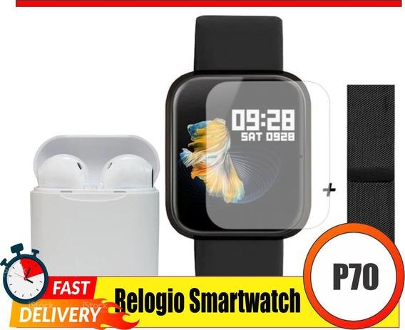 Relógio Smart Watch Feminino Oled P70 + Duas Pulseiras Preto – O relógio Possui a opção de poder colocar sua própria foto como capa do relógio. – Receber Notificações de redes sociais SMS entre outros. – Basta Girar o pulso para mostrar as horas. – 3 Modelos de mostradores de relógio diferentes para uso (analógico e digital) – Lembrete sedentário, te lembra que você está muito tempo parado e precisa levantar, alongar, etc. – Alarme com vibração para que não perca o horário – Controla as músicas do seu celular (troca música, antes, depois, pause e play) – Previsão do tempo diário direto no seu relógio – Batimentos Cardíacos – Controle de sono – Calcula passos, km e calorias – GPS – Rota (Usando App No celular) – Controle de Pressão Arterial – É possível aumentar e diminuir luminosidade da tela – Excelente Tempo de Duração da bateria – Carregamento magnético – Photo Control, mire com o celular no local onde quer bater a foto e clique no relógio para bater a foto direto pelo relógio – 8 modelos de sensores de movimentos para controle de diferentes esportes na palma da sua mão (Caminhada, Corrida, Pular Corda, Bike, Badminton, Basquete e Futebol) – Pulseira com fecho magnético ergonômico ajustável (milanese) ou pulseira de silicone, serve para todos os pulsos. – É possível trocar de pulseiras ESPECIFICAÇÕES: – Cor PRETO – Display colorido – Tamanho da Tela: 38mm – 1,3 polegadas – Bluetooth 4.0 – Método de carregamento: interface in-line de carregamento magnético – Bateria: 200mAh – Tempo de carregamento: 2 h mais ou menos – Matérias da pulseira: Silicone e Milanese (Magnética) – Resolução: 240 PRODUTO ACOMPANHA: – 1 Smartwatch – 1 Manual (Inglês, Alemão, Francês, Chinês, Espanhol) – 1 Pulseira Silicone + 1 Pulseira Milanese – 1 Carregador para o Relógio