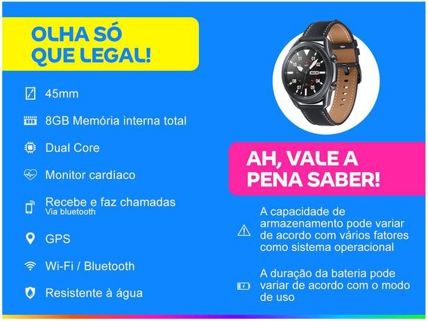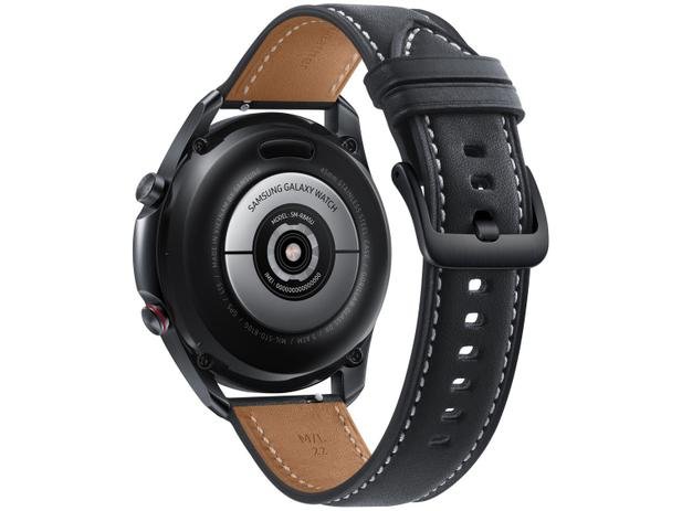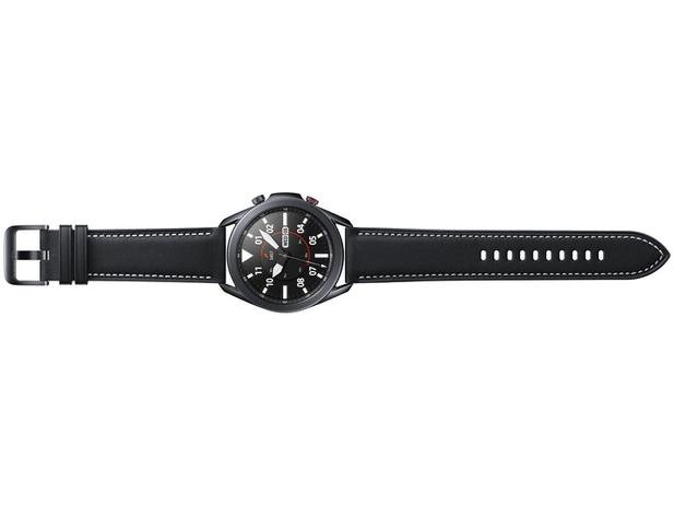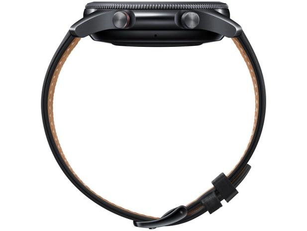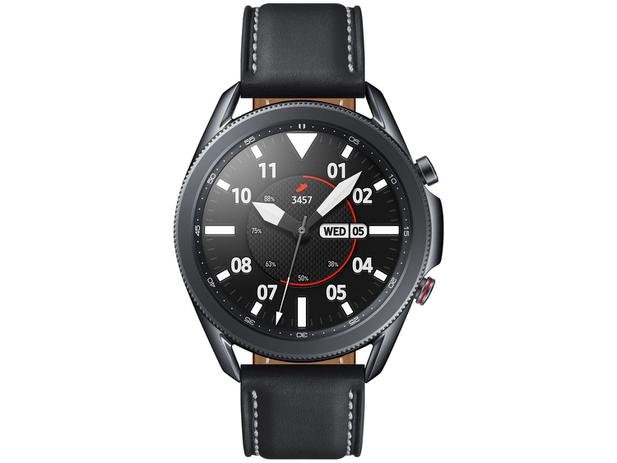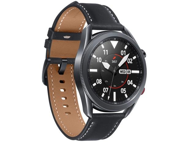 O Galaxy Watch3 LTE da Samsung tem um design clássico e refinado. Sua caixa de metal é feita com material premium em aço inoxidável, além de resistente seu formato proporciona conforto no pulso. Esse smartwatch possui caixa de 45mm e sua coroa giratória torna o acesso as funções e aplicações mais rápido e facilitado. É um produto ideal para quem precisar monitorar a saúde e bem estar de uma forma prática e facilitada. Além de uma série de funções avançadas para acompanhar a sua evolução nos treino e nos esportes. Possui conectividade em uma rede móvel 4G LTE, que lhe confere a versatilidade de uso independente do smartphone, não apenas para fazer chamadas telefônicas, mas para receber e responder suas mensagens a qualquer momento e em qualquer lugar. Ele ainda vem equipado com GPS que rastreia com maior precisão suas trilhas preferidas. Também está equipado com funções inovadoras que vão facilitar o seu dia-a-dia, seja no lazer ou no trabalho, como o controlador de câmera, controlador de músicas remoto, controle de PPT, função de pagamento móvel por meio do Samsung Pay e 8GB de memória interna. Sua pulseira preta em couro legítimo oferece visual natural e elegante.
