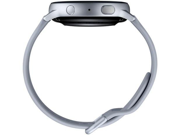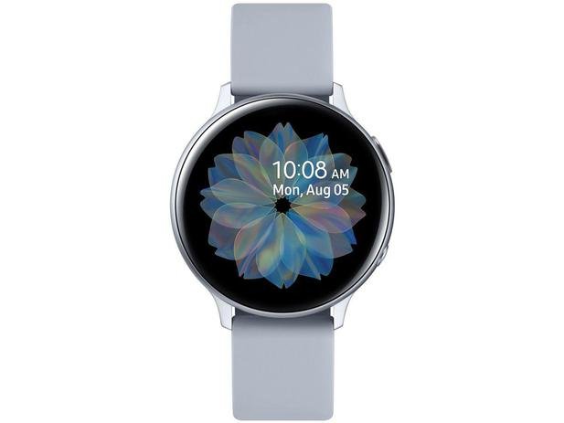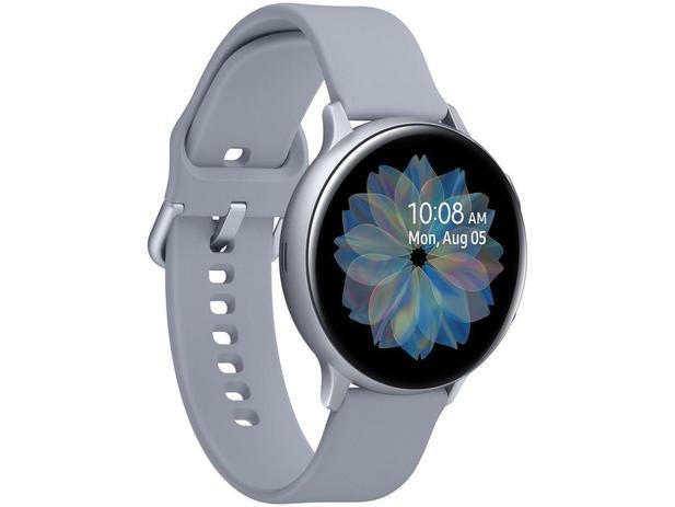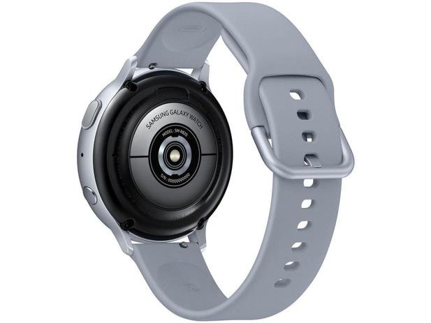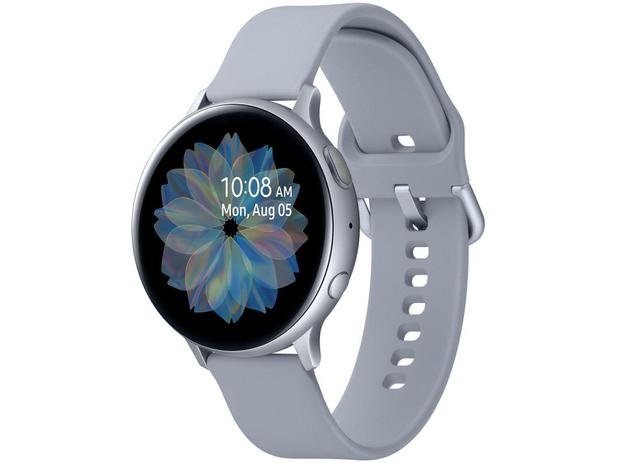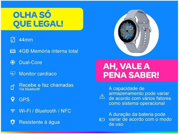 O Galaxy Watch Active2 da Samsung tem um design minimalista inovador e moderno. Sua caixa tem 44mm feita em alumínio, que é leve e resistente. Com display de 1.4″ e uma tela com bordas finas, que oferece maior brilho e melhor visualização de conteúdo. Possui uma coroa virtual o que torna o acesso as funções e aplicações mais rápido e facilitado. Disponível na cor prata, sua pulseira prata de borracha fluorelastômero traz um visual sofisticado. Com microfone e alto-falante embutidos permitem receber e fazer chamadas telefônicas, enquanto pareado com o smartphone. Recebe mensagens e notificações. É um smartwatch ideal para quem tem um estilo de vida saudável, para a prática de esportes e monitoramento da qualidade de sono e nível de stress. Ele vem equipado com GPS que rastreia com maior precisão suas trilhas. Além das novas funções para facilitar seu dia-a-dia, como controlador de câmera, acesso a redes sociais, calculadora, pois conta com 4GB de memória interna. E se você acha que isso é pouco, ele ainda permite que você faça combinações de roupas com o visor do relógio. Ao tirar uma foto do seu look do dia, o seu smartwatch escolherá um mostrador de relógio para combinar com o seu visual e o seu humor, deixando ele com a sua cara.